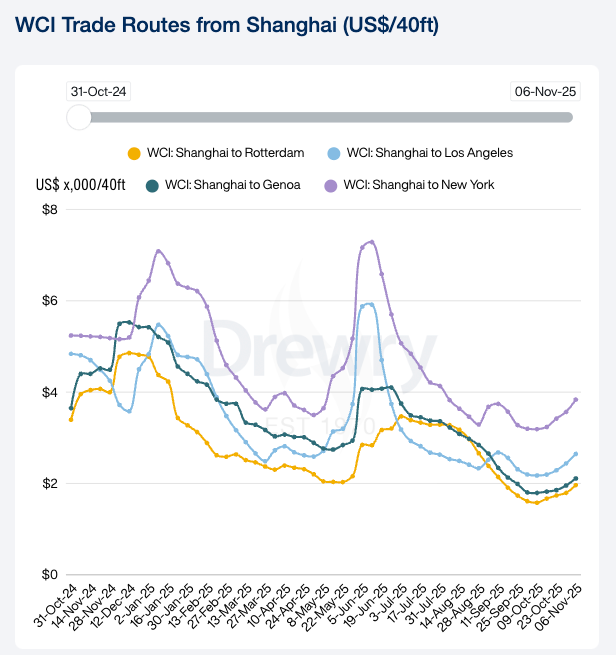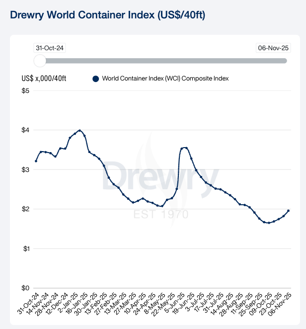 - Drewry WCI: เพิ่มขึ้น 8% อยู่ที่ $1,959 per 40ft . (6 พ.ย. 2025)